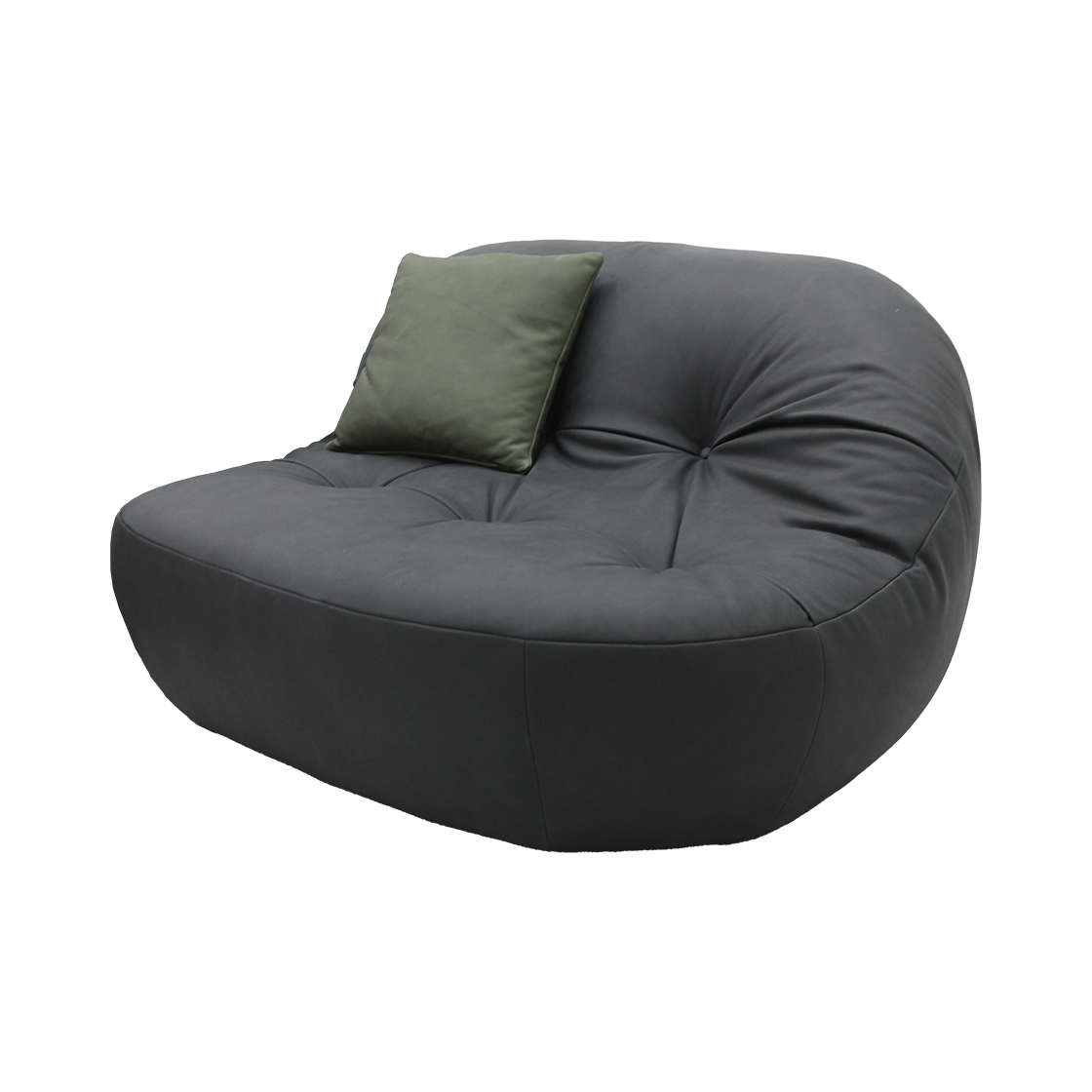 부드럽고 풍성한 곡선으로 채워진 형태가 특징인 제품입니다. 둥글고 푹신한 디자인은 마치 부드럽게 감싸는 느낌을 주며, 편안한 휴식을 제공합니다. 섬세한 주름이 포인트가 되어, 단순히 편안함만을 넘어 세련된 미감을 자아냅니다. 차분한 그레이 컬러의 가죽과 함께 놓인 그린색 쿠션은 현대적이면서도 자연스러운 조화를 이루며, 공간에 우아하고 아늑한 분위기를 더해줍니다.