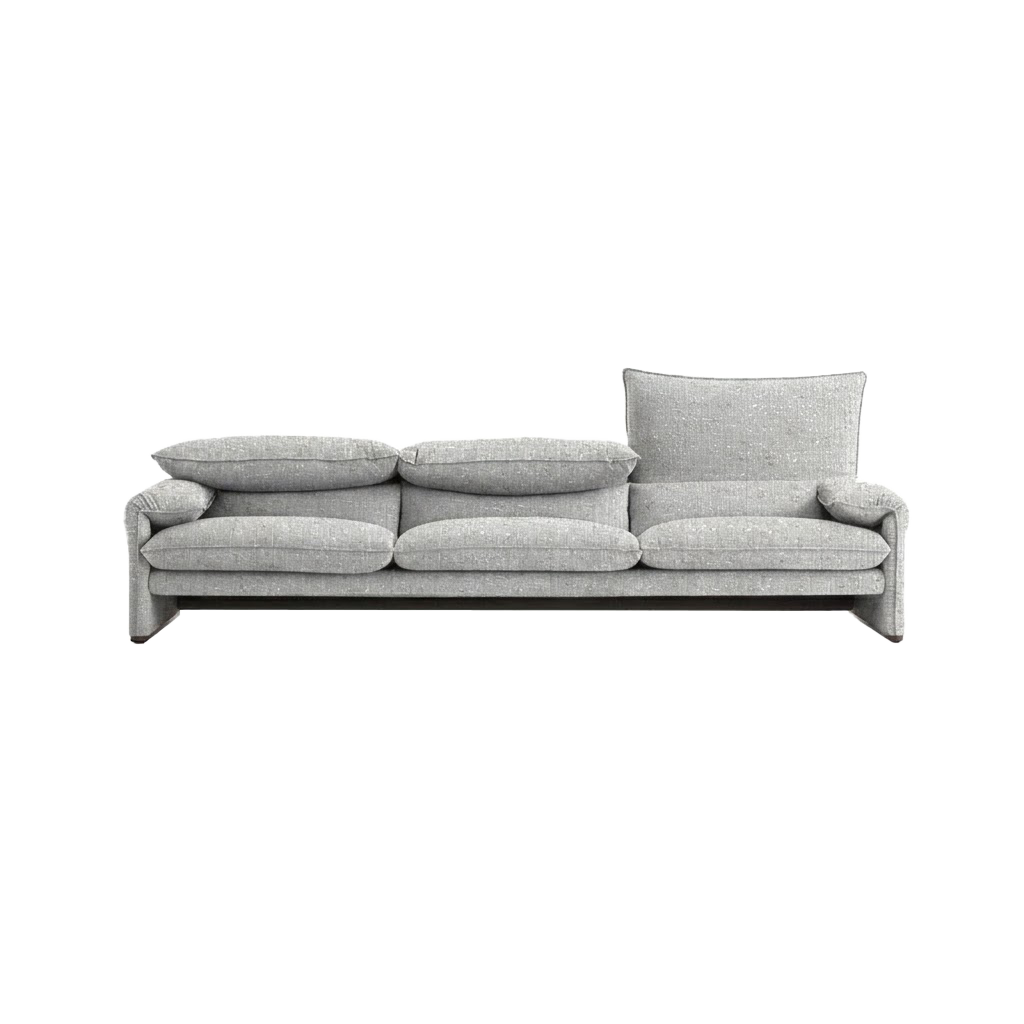 차분한 그레이 색상과 심플한 디자인으로 어떤 공간에도 자연스럽게 어울립니다. 부드러운 패브릭 소재와 풍성한 쿠션들이 편안함을 제공하며, 다소 낮고 넓은 좌석이 여유로운 휴식을 가능하게 합니다. 소파의 팔걸이는 과감하게 낮고, 등받이는 높이가 조절 가능한 형태로, 다양한 앉을 자리를 제공하여 다채로운 사용이 가능합니다. 직선적이고 깔끔한 라인으로 구성된 디자인은 미니멀하면서도 세련된 느낌을 주며, 편안한 분위기를 자아냅니다.