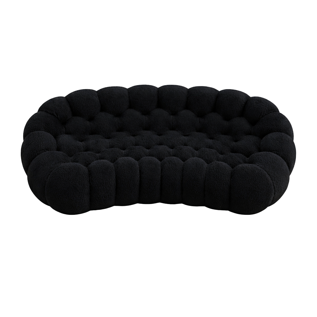 다채로운 둥근 형태로 구성된 독특한 디자인이 특징입니다. 부드럽고 풍성한 쿠션들이 마치 구름처럼 포근하게 배열되어 있어, 어떤 각도에서 앉아도 편안한 휴식을 제공합니다. 짙은 검정색 패브릭은 세련되고 모던한 느낌을 주며, 곡선형의 유려한 라인은 공간을 더욱 아늑하고 세련되게 만듭니다. 이 소파는 시각적으로도 탁월한 디자인을 자랑하며, 현대적인 감각을 중요시하는 인테리어에 완벽하게 어울립니다.